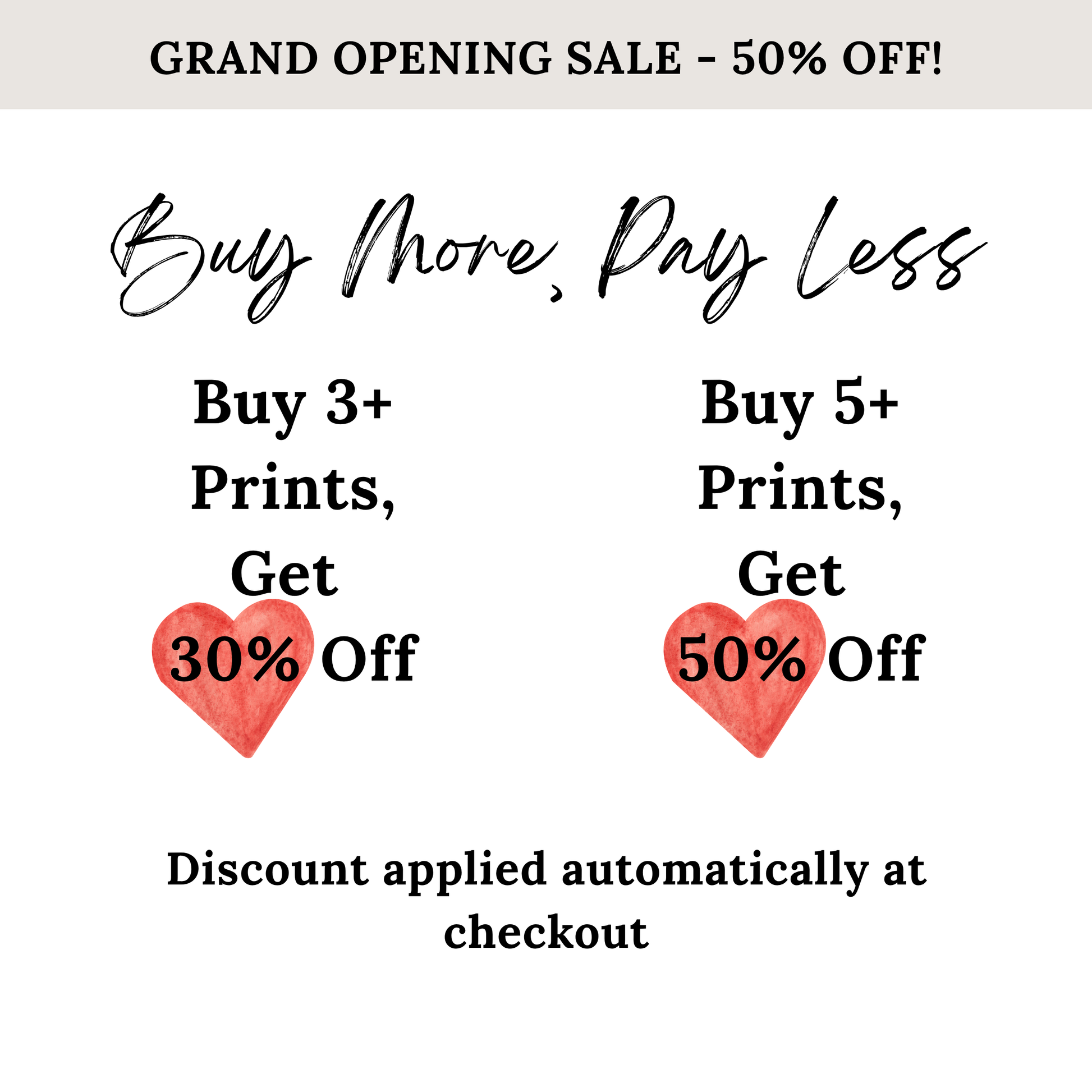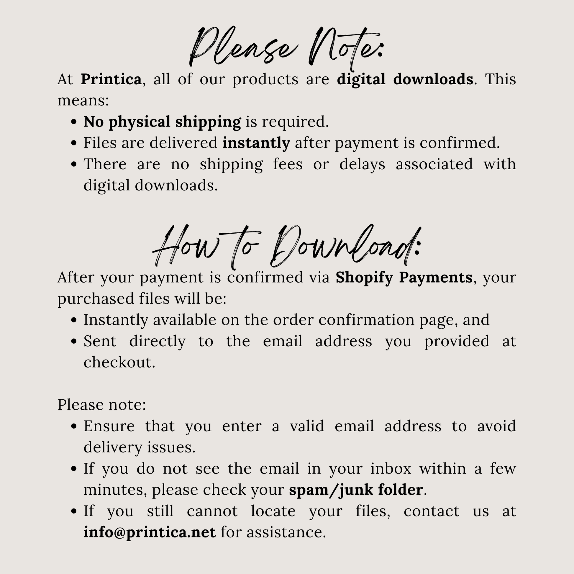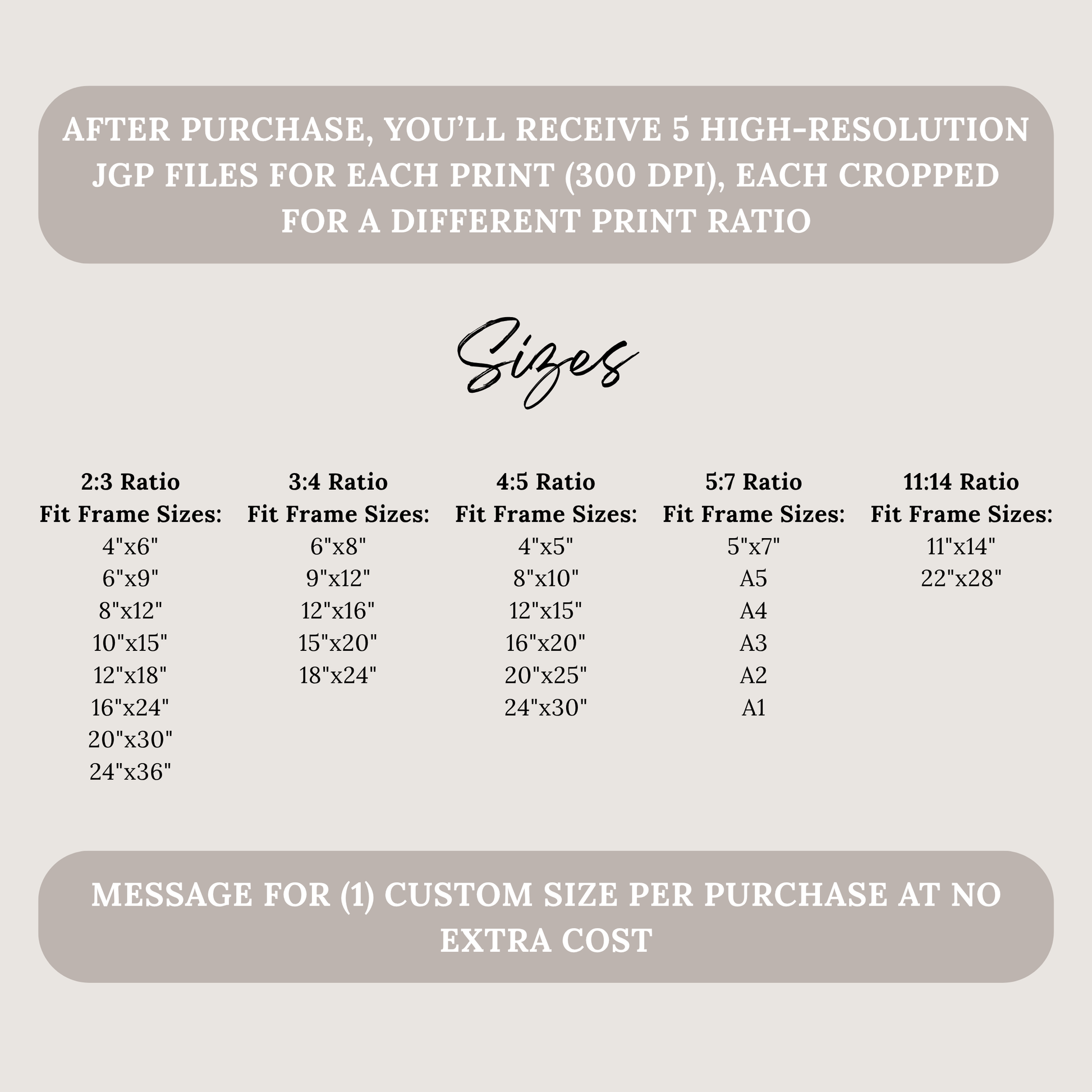 After your purchase, you’ll receive a PDF containing a secure Google Drive link, where you can download all 300+ high-resolution JPG prints (300 DPI) in five different sizes each.